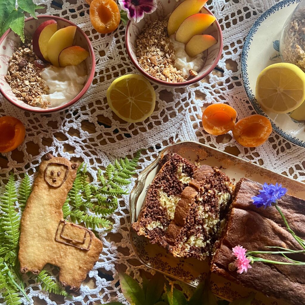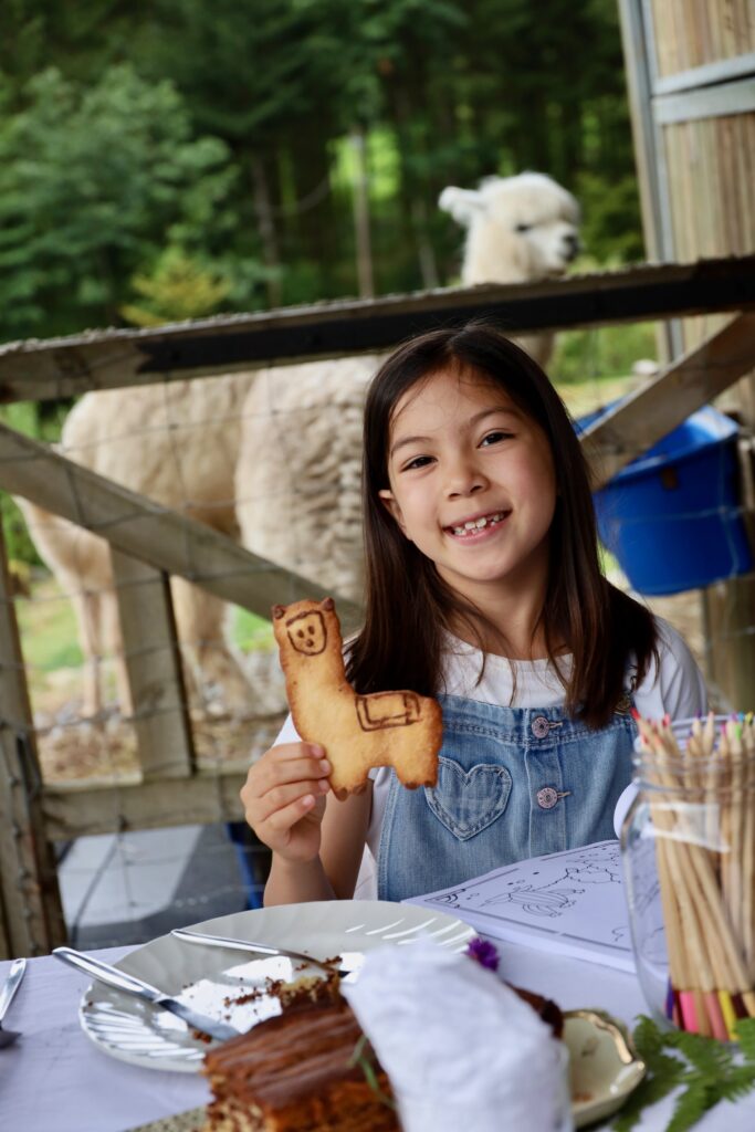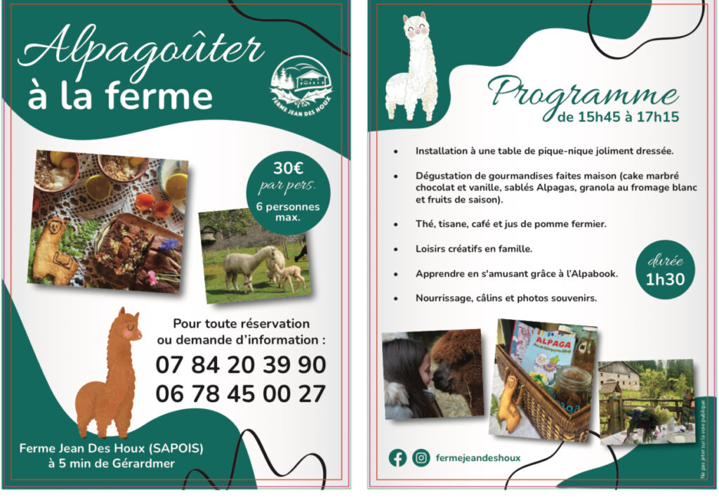 - Goûter 100 % fait maison : cake ou tarte du jour, granola maison accompagné de fruits frais, sablés en forme d’alpaga, café, thé, eau et jus de pomme artisanal de la ferme.